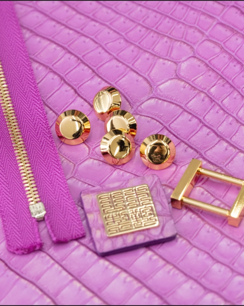 24金純金粉と、オリジナル設計の24金仕上げ金具 クロコダイル革の腑のエッジへ、純度の高い純金粉を筆でひとつひとつ手作業で付着させています 。これにより、クロコダイル特有の立体感と輪郭が静かに際立ちます 。 また、プレミアムモデルの金具はすべてオリジナル設計 。表面には通常の約4倍の厚みを持つマイクロポーラスメッキを採用し 、ハンドル金具と底鋲には0.7μm厚の24金仕上げを施しました 。使い込むほどに確かな質感として現れます。